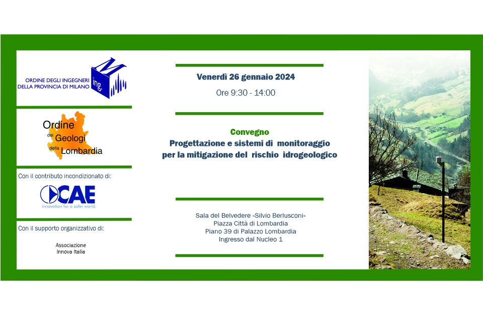 26 gennaio, Milano | Si è tenuto lo scorso venerdì a Milano il Convegno “Progettazione e sistemi di monitoraggio per la mitigazione del rischio idrogeologico”, organizzato dall’Ordine degli Ingegneri della Provincia di Milano e dall’Ordine dei Geologi della Lombardia, con il contributo incondizionato di CAE.